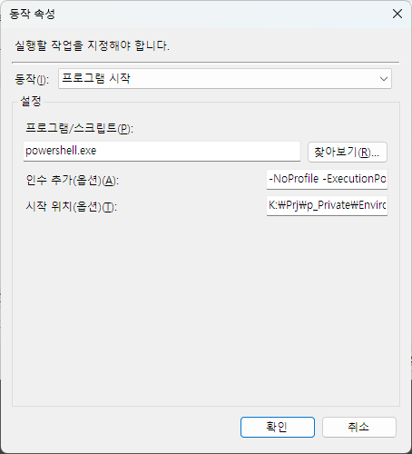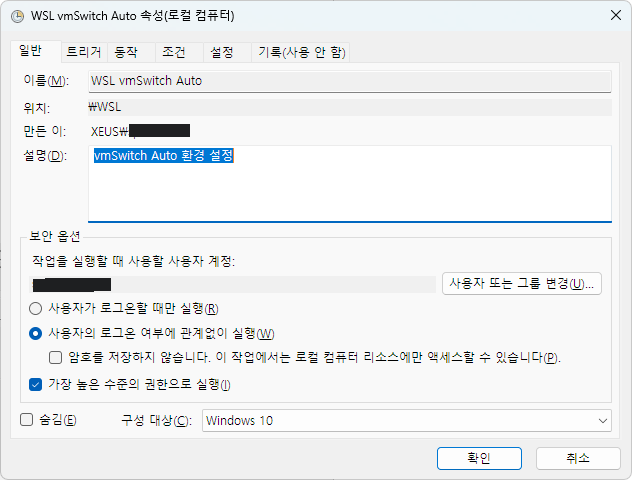 인수 추가 옵션 = -NoProfile -ExecutionPolicy Bypass -File "C:\Script\wsl-set-vmswitch.ps1"