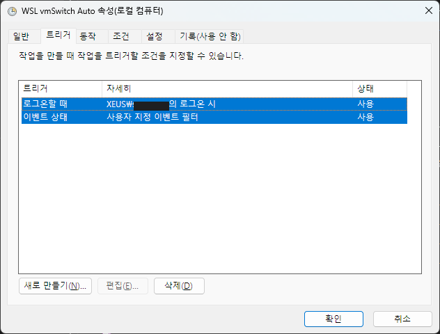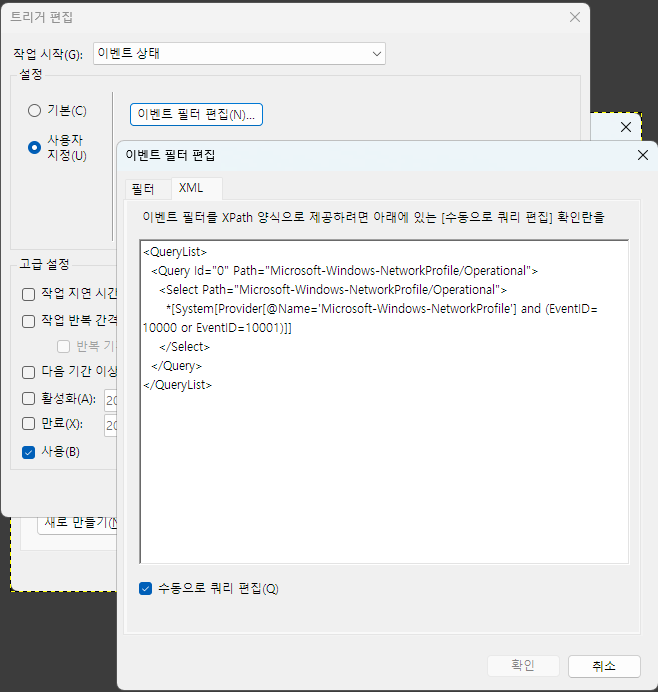 트리거 설정은 "로그온 시" 와 이벤트 상태 두 개를 추가합니다.