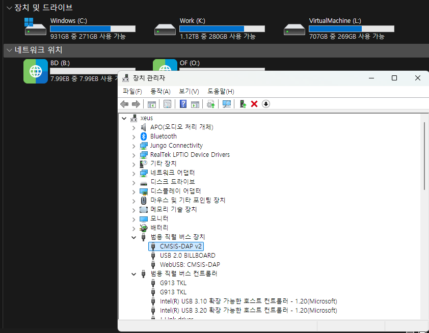 - Drag & Drop 으로 "*_if.bin " 파일을 집어 넣은 후 자동 리셋 후 APPLICATION 펌웨어가 가동 되면서 나타나는 장치 관리자와 그리고 사라진 MAINTENANCE 드라이브 화면