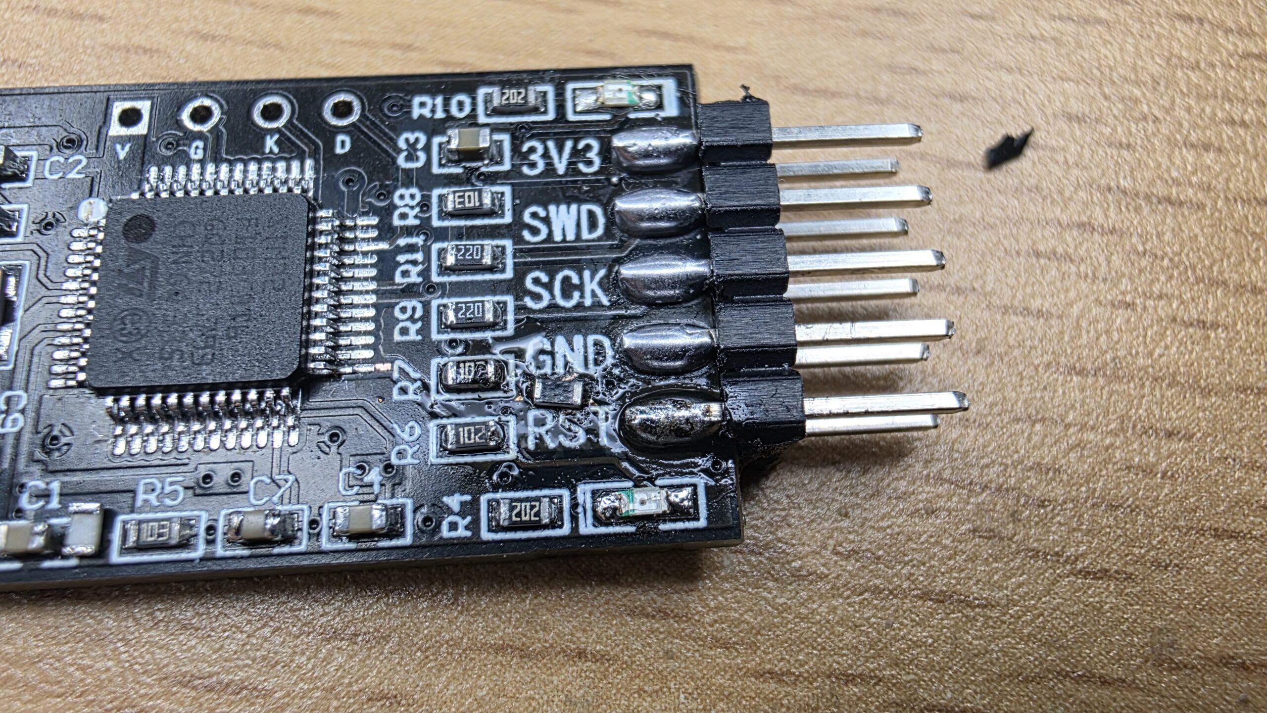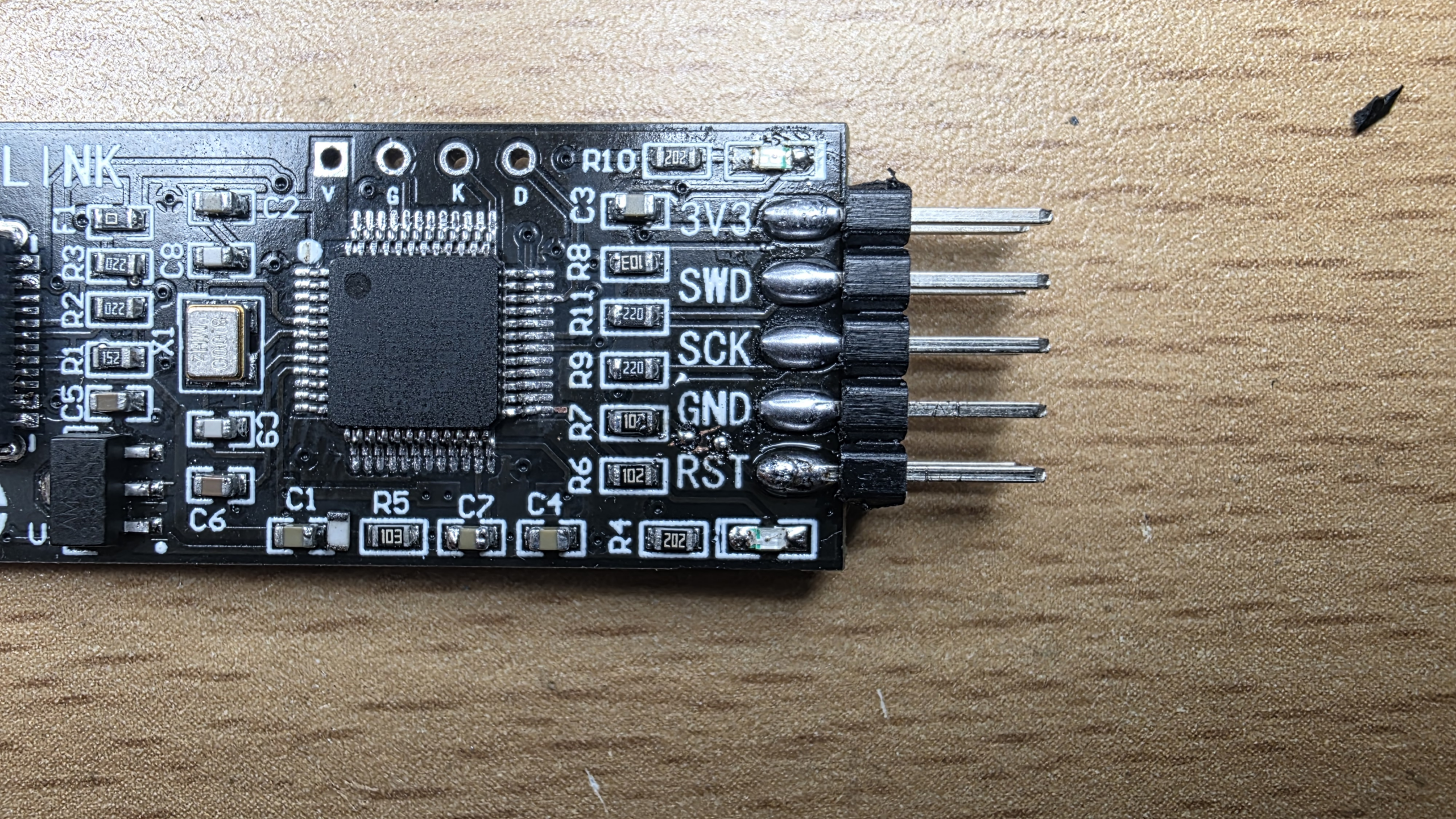 - 원본에는 nRST Pin 에 10K 저항이 Pullup 되어 있으나 구매한 보드에는 없어서 10K 저항 Pullup 시킴 ( 이 저항이 없을 경우 Bootloader 로 진입이 안됨, 물론 소스코드에서 내부 풀업 사용으로 수정할 수 있으나 여기서는 안함) :: 리셋핀 왼쪽에 3.3V 전원 VIA 가 있어 솔더 마스크 벗겨냄